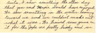 In a letter from January 14, 1944, my grandpa wrote about one day when his ship was several miles out, and something was swimming up to them.* They didn't know what it was for a while, so they had their guns trained on it in case it was a Japanese soldier. (He said, a "Jap," and that they were "tricky." You can read his words below.) It turned out to be a water buffalo that they presumed was scared into the ocean by all the warfare on shore, and was now looking for some safe landing (which makes my disney-fied self unspeakably sad, but that's another story.) It couldn't get on board, so there wasn't much they could do aside from not shooting it (which they didn't). So on it went, and on they went, amid air raids and being shot at and watching planes dive bomb their fellow ships.